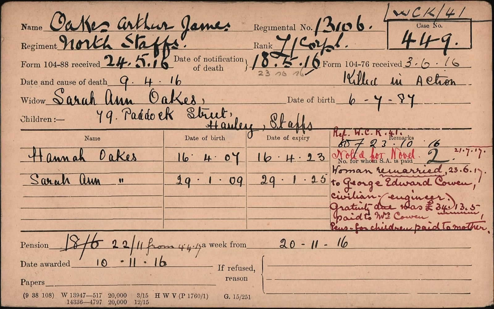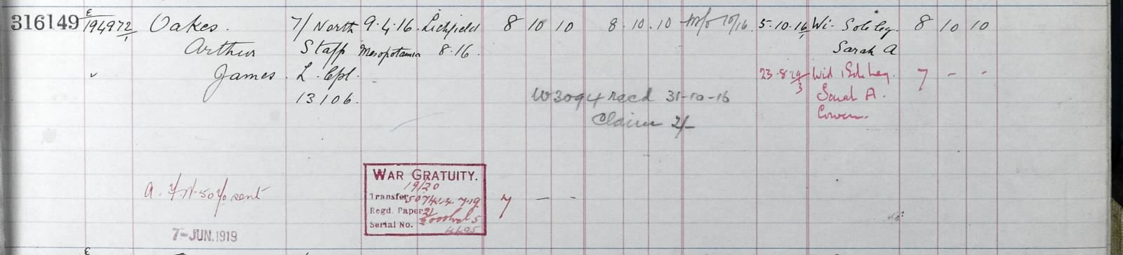 His effects were sent to his widow Sarah Ann Cowen (previous Oakes). Sarah Ann had remarried on the 23rd June 1917 to George Edward Cowen. She was however still granted a widows pension of 22 shilling and 11 pennies from 20th November 1916. Her address being 4 Austin Street Wolverhampton.