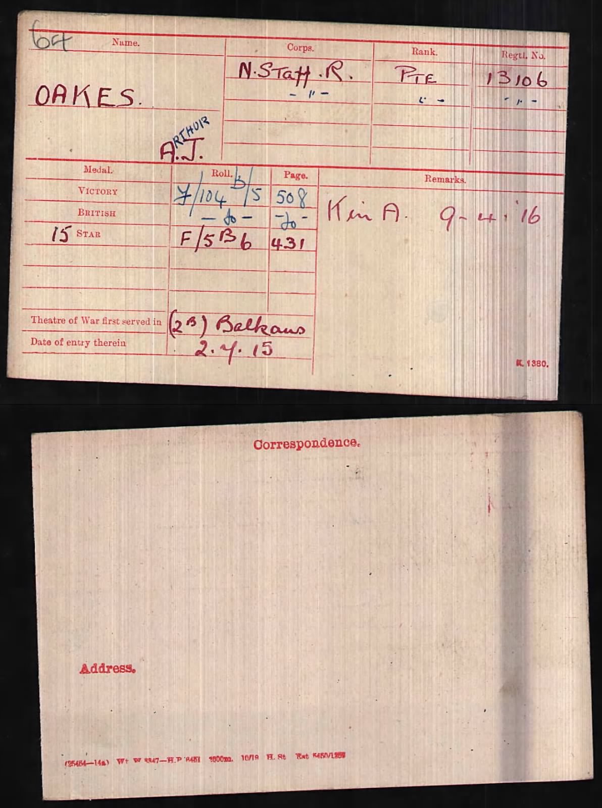 Leonard Oakes also joined the Army on the 25th August 1914 aged 19 years 9 months as 11191 Pte Oakes, North Staffordshire Regiment at which time he was a Collier but previously a Potters Presser living at 22 Paddock Street, Hanley. He was described as 5’7” 141 pounds weight, 36 ½ chest with a sallow complexion, blue eyes and brown Hair. He was thought to be of good physical development. He was however discharged after 3 months service on the 7th November 1914 deemed unfit for active service due to Myopia. The Sentinel newspaper article dated July 14th 1917 reports Leonard Oakes as being a Driver in the RFA. Pension card dated his discharge as 9.2.19, service number 82049 rank Gunner. address 7 Thorley St, Hanley.