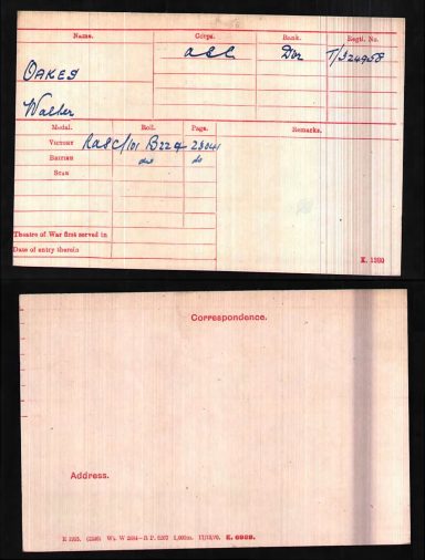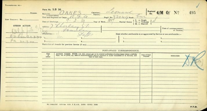 Leonard Oakes : Fold3, UK, WWI, Pension Ledgers and Index Cards, 1914-1923 (https://www.fold3.com/publication/1019/uk-wwi-pension-ledgers-and-index-cards-1914-1923 : accessed 17 Jan 2026), database and images, https://www.fold3.com/publication/1019/uk-wwi-pension-ledgers-and-index-cards-1914-1923