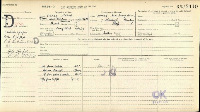 Albert Oakes : Forces War Records, UK, WWI, Pension Ledgers and Index Cards, 1914-1923 (https://uk.forceswarrecords.com/publication/1019/uk-wwi-pension-ledgers-and-index-cards-1914-1923 : accessed 17 Jan 2026), database and images, https://uk.forceswarrecords.com/publication/1019/uk-wwi-pension-ledgers-and-index-cards-1914-1923