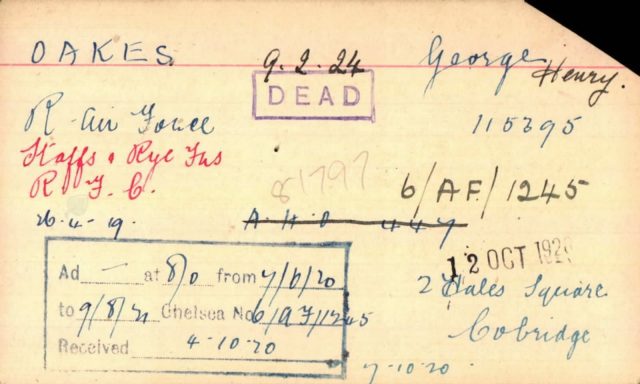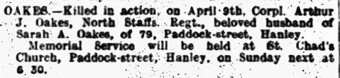 George Henry Oakes remarried in 1913 after his wife Florence died. The same Sentinel newspaper dated 1917 reports George Henry as being in the North Staffs Regiment, however, it seems he transferred 26.12.1917 to the RAF ,official number being 115395. Recorded as living at 8 Hales Square Burslem working as a China Biscuit Overman with wife Phoebe Elizabeth Oakes.