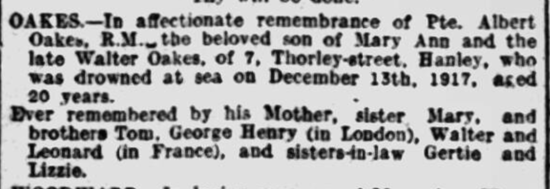 His younger brother Albert Oakes also served in WW1. He was PO/18206 Albert Oakes of the Royal Marine Light Infantry. Killed In Action when his ship HMS Stephen Furness was torpedoed and sunk in the Irish Sea on the 13th December 1917. He is remembered on the Portsmouth Naval Memorial Panel 27. He was entitled to the 1914-15 Star, British War Medal and Victory Medal.