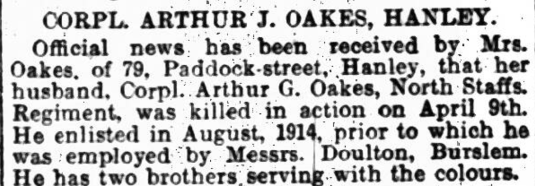 Arthur was the second eldest child; his older brother George Henry Oakes was born 31st may 1882 at Tunstall.