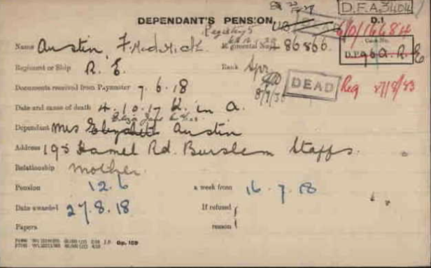 Sapper F. Austin, Burslem. Mrs. Austin, 189, Hamil-road, Burslem, has received official news that her son, Sapper Frederick Austin, Royal Engineers, has been killed in action. He joined the Army in November, 1915, prior to which he was employed by Messrs. Doulton and Company, Burslem. In a letter to Mrs. Austin, an officer, states that Sapper Austin was always cheerful and willing to perform his duties.