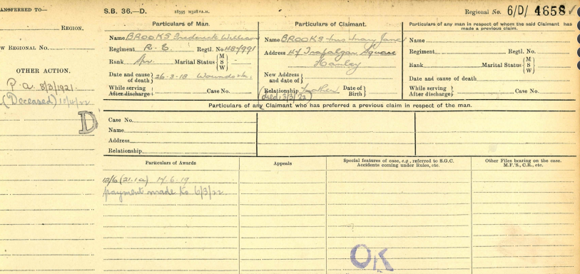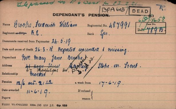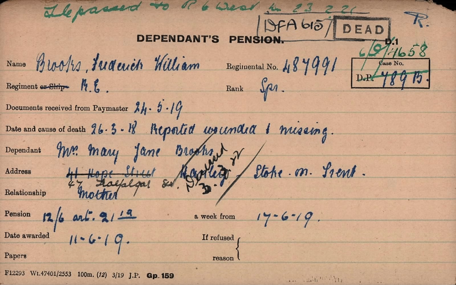 Army Pension Cards show differing addresses of his family, these being 24 Waterloo Road, Burslem and 47 Trafalgar Square, Hanley and 41 Hope Street, Hanley. It also shows us his family pension award being made to his mother on 11.06.1919.