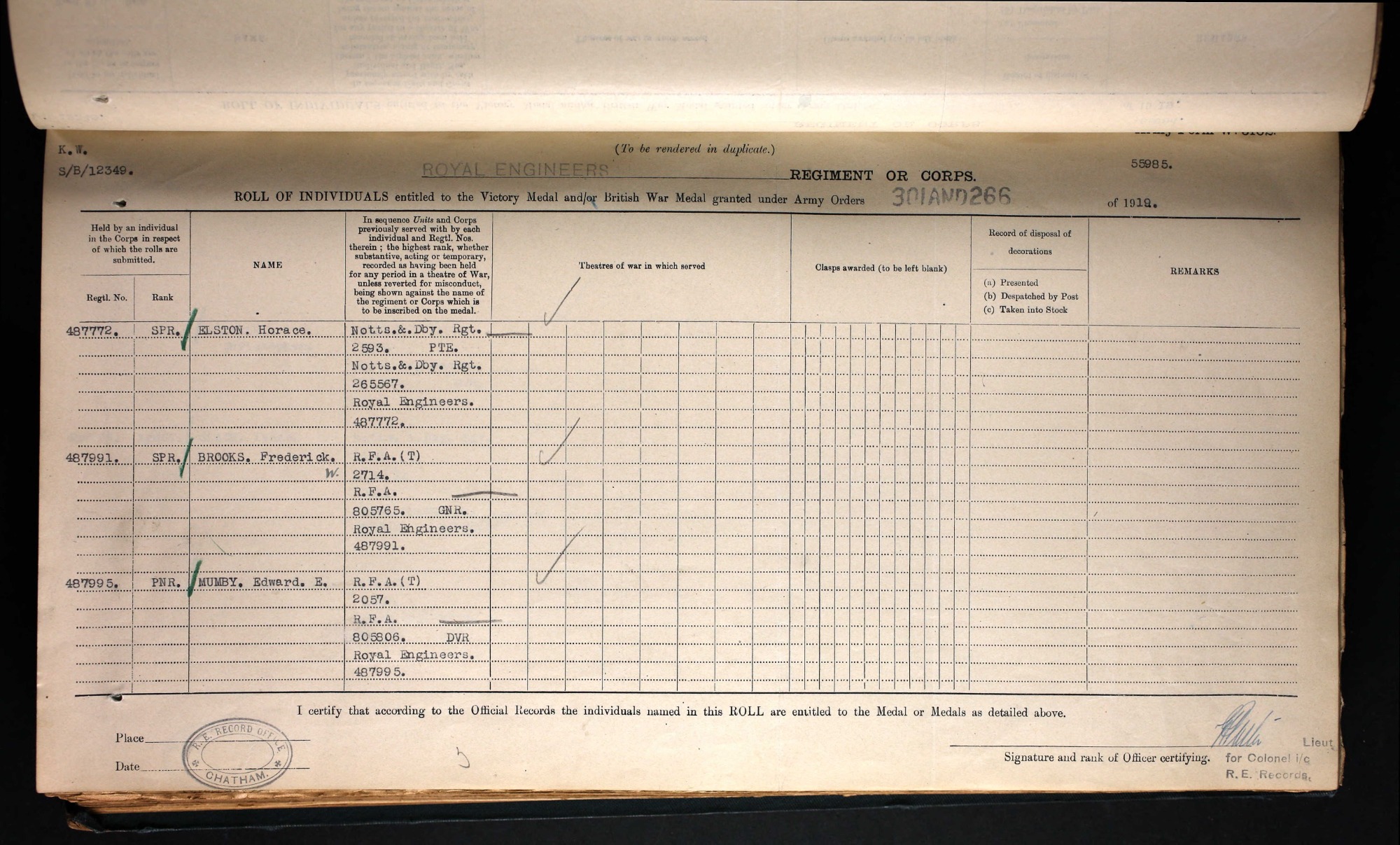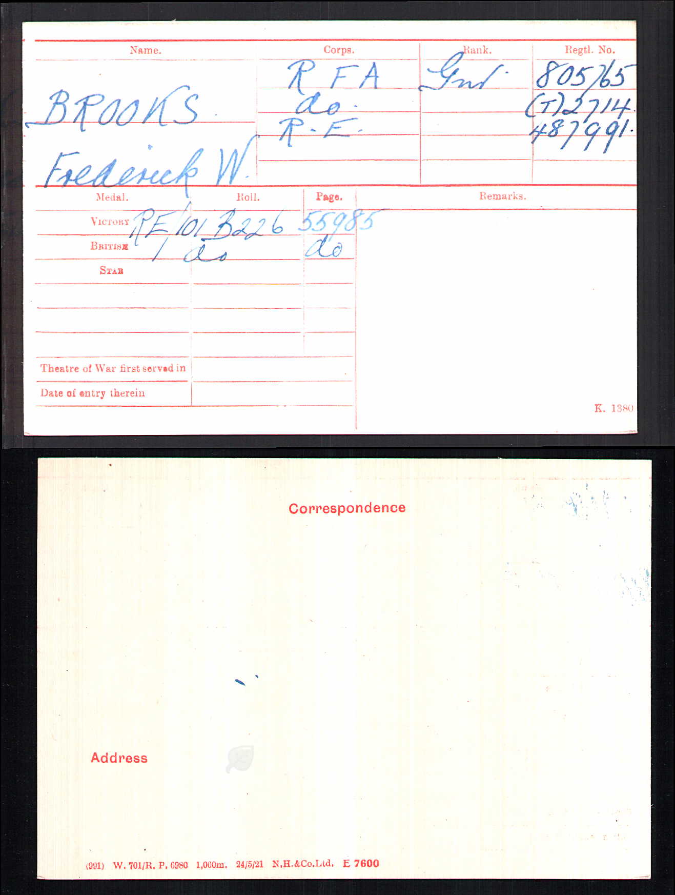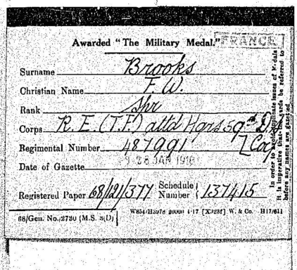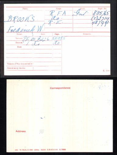 It is not known when Frederick William Brookes joined the military but we can tell from his Medal Index Card that he was a pre-war territorial soldier having the service number T2714 Royal Field Artillery. He also served with service number 805765 before being renumbered 487991.