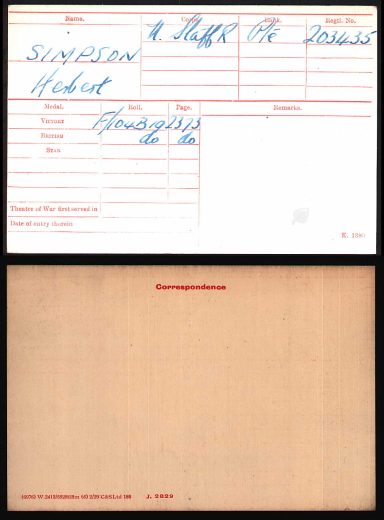 Herbert (Wesley) Simpson born 7th November 1885, Burslem married Annie Dale in 1914 they had children Frank born 1915. Emily born 1917, Herbert. H. born in 1918 but died in 1919, Annie born 1919 and Herbert born in1920. Herbert worked as a Potters Dipper. He too was in the war as Private 203435 2/6th North Staffordshire Regiment, he was captured on 21st March 1917 at Bullecourt and was a prisoner of war in Dunain, France.He was classed as unwounded (Unverwundet). He survived and was awarded the British War Medal and Victory Medal.