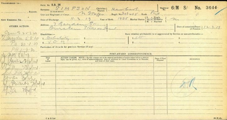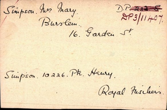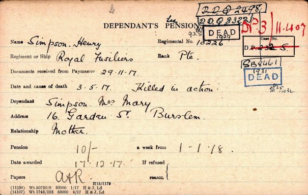 WW1 pension cards reveal his mother is recorded as his next of kin living at 16 Garden Street, Burslem. She was awarded a dependants pension of 10 shillings per week payable from the 1st January 1918.