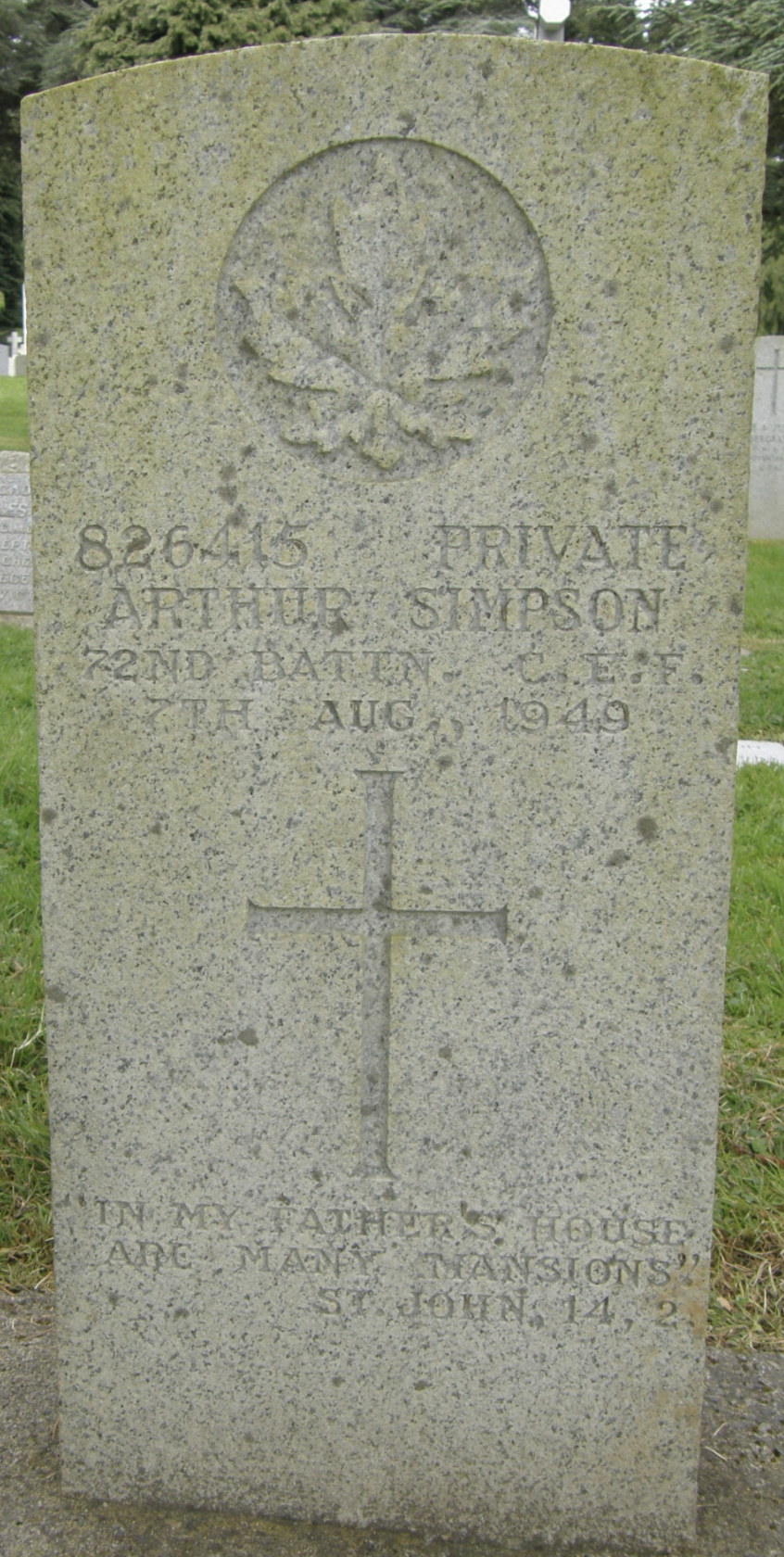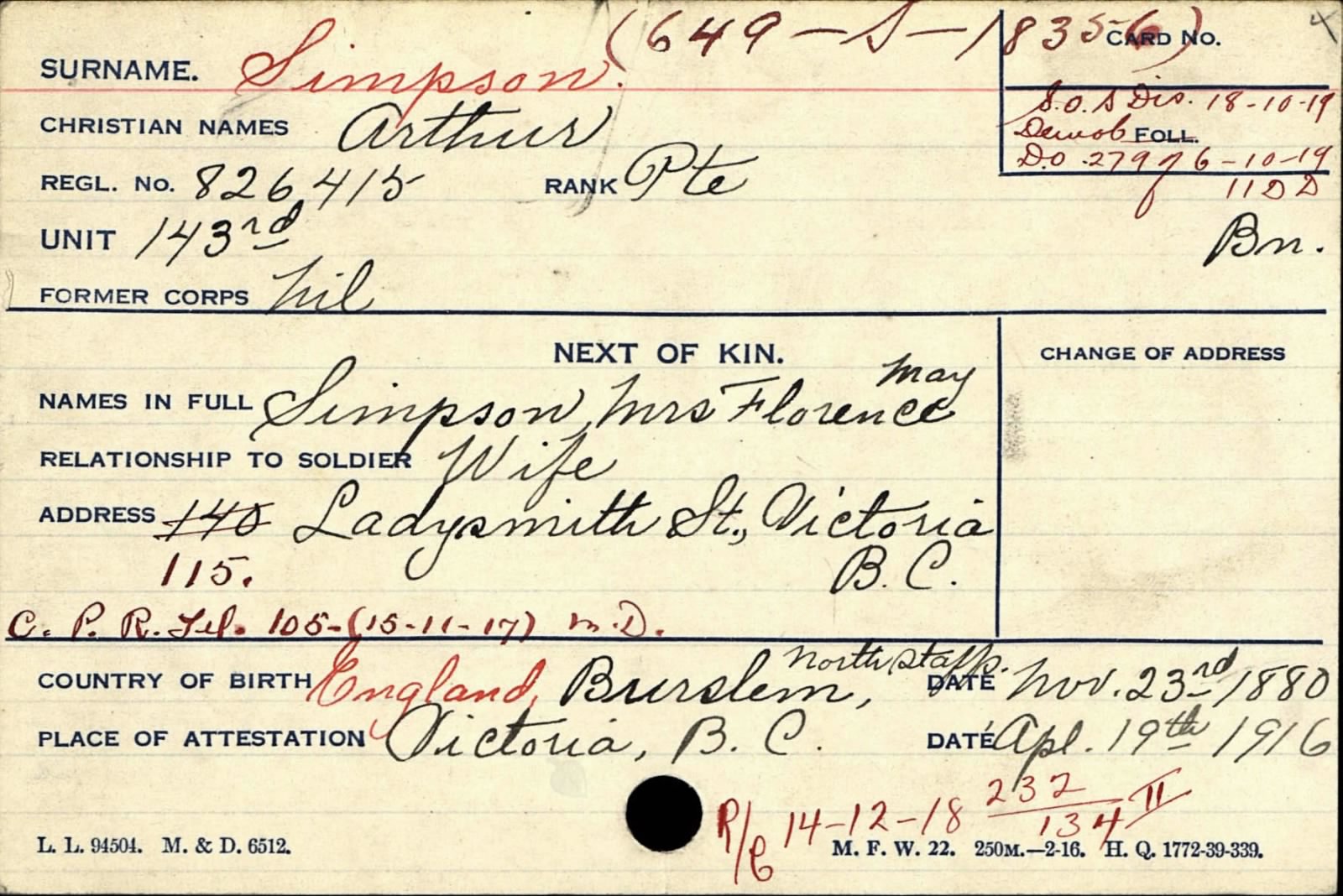 Arthur Simpson born November 3rd 1880 - Burslem, he married Florence May Walters in 1900.They had two children, Harold (c1903) and Arthur J. H. (c1910). Both children were born in Wolstanton, therefore it is suggested that Arthur and his family emigrated to Canada after 1910 and before 19th April 1916 when Arthur enlisted and served with the 72nd Battalion (Seaforth Highlanders) Canadian Expeditionary Force as Private 826415.