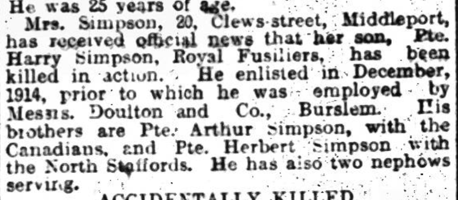 The Staffordshire Sentinel of the 7th June 1917 carries a report of his death and confirms he worked for Royal Doulton prior to military service and that 2 of Henry’s brothers were also serving ( Herbert and Arthur).