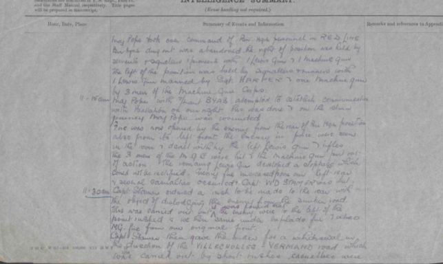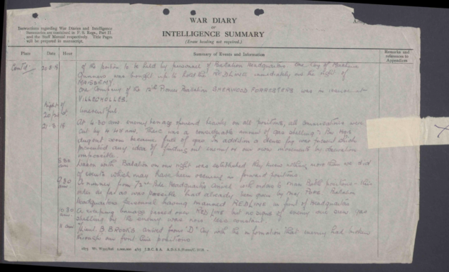 On 21 March 1918, the 1st Battalion was in front-line trenches near Saint Quentin when the German Army launched Operation Michael, the opening attack in their Spring Offensive. The battalion was virtually wiped out, losing 19 officers and 662 men in the attack itself and the withdrawal which followed. The Battalion war diary tells us that on this day the 1st Battalion North Staffordshire Regiment were in forward positions outside a village named Vermand near St Quentin.The British were not expecting an attack as no intelligence they had gathered pointed to this. However at 4.30am on this day the Germans laid down a heavy and creeping artillery barrage on the battalion's position. Confusion reigned as amongst the regular high explosive artillery were gas shells. The battalion HQ situated in REDLINE (TRENCH MAP) was filled with gas causing its staff to evacuate it. To add to the confusion there was a layer of fog which caused reduced visibility so defenders had difficulty with visibility of both the enemy and their own troops/positions. From the HQ both servants, runners and signallers manned REDLINE in front of HQ. On the right were servants and signallers with a Lewis gun team and a machine gun. On the left a Lewis gun team manned by runners and signallers and one machine gun manned by the Machine Gun Corp. Within 15 minutes all the Lewis/Machine Guns had been hit or became unable to operate. Germans had entered the positions and the battalion tried to withdraw. The battalion conducted a fighting retreat inflicting losses on the Germans but plenty of casualties were suffered by the battalion and many were taken prisoner. The battalion remnants made it to an area between Vermand and Maissemy. The battalion continued to fight until the 27th March before being retired.