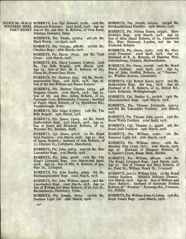 PTE. J. ROBERTS, 1st Battalion, N.S. Regiment (Lewis Gunner) reported Missing since March 21st, 1918. Any news concerning him will be thankfully received by his Mother. Mrs. Roberts, 19, WaterIoo-road, Burslem. Stoke-on-Trent.
