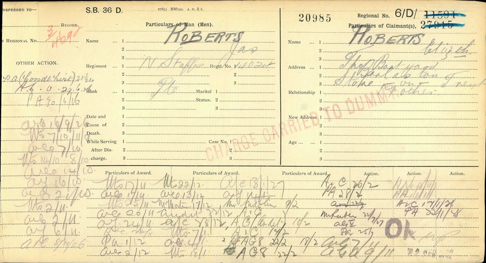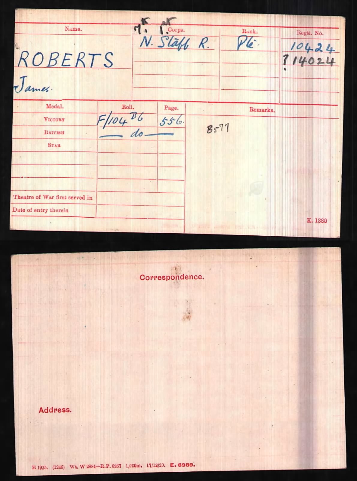 James' WW1 service record survives and provides useful information. We see he was a pre-war territorial soldier as he first carried the service number 8753 with the 7th Battalion North Staffordshire Regiment. He had attested to full service on the 31st August 1914. At this time he states he was born and living in Sneyd, Burslem, is 19 yrs old and employed as a Printer with Doulton Ltd. He was 5’6” tall weighing 119lbs with brown hair, blue eyes, fresh complexion and a chest measurement of 34”/3” expansion. His mother’s name is shown as Elizabeth Roberts of 19 Waterloo Road, Burslem but on documents dated 1920 her address is The Boat Yard, Barlaston, Staffordshire. Elizabeth Roberts was found on the 1921 census still living at the Barlaston Boatyard, working as a Home worker.
