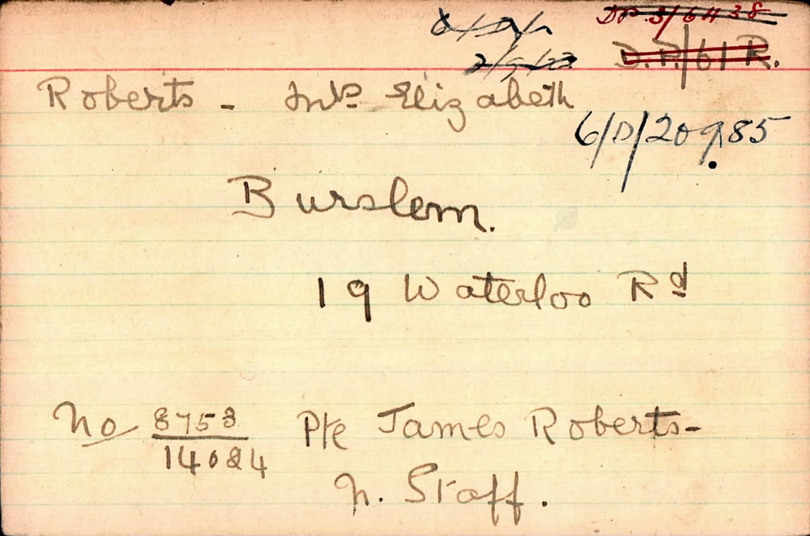 James Roberts was born at 115 Leek Road, Burslem, Staffordshire on May 17 1896 to parents James Roberts a Potter's placer born c1859 at Smallthorne, Staffordshire and Elizabeth nee Highfield born c1861 at Newcastle, Staffordshire. James Roberts senior and Elizabeth Highfield were married at Cobridge, Christ Church on the 25th December 1888. It would appear that James was an only child.