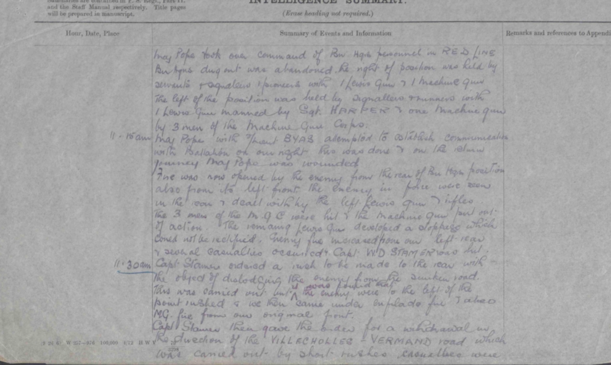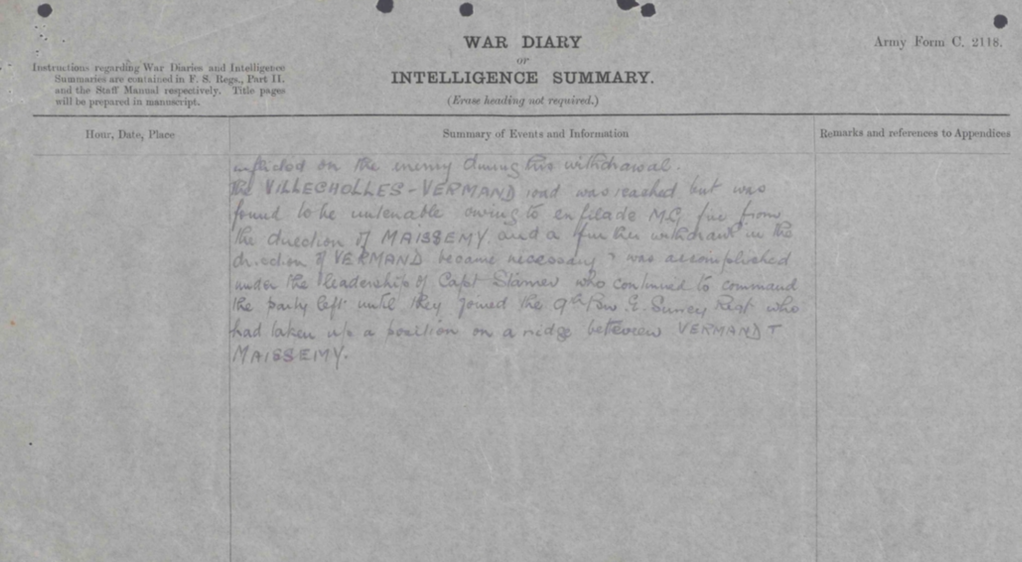 On 21 March 1918, the 1st Battalion was in front-line trenches near Saint Quentin when the German Army launched Operation Michael, the opening attack in their Spring Offensive. The battalion was virtually wiped out, losing 19 officers and 662 men in the attack itself and the withdrawal which followed. The Battalion war diary tells us that on this day the 1st Battalion North Staffordshire Regiment were in forward positions outside a village named Vermand near St Quentin.The British were not expecting an attack as no intelligence they had gathered pointed to this. However at 4.30am on this day the Germans laid down a heavy and creeping artillery barrage on the battalion's position. Confusion reigned as amongst the regular high explosive artillery were gas shells. The battalion HQ situated in REDLINE (TRENCH MAP) was filled with gas causing its staff to evacuate it. To add to the confusion there was a layer of fog which caused reduced visibility so defenders had difficulty with visibility of both the enemy and their own troops/positions. From the HQ both servants, runners and signallers manned REDLINE in front of HQ. On the right were servants and signallers with a Lewis gun team and a machine gun. On the left a Lewis gun team manned by runners and signallers and one machine gun manned by the Machine Gun Corp. Within 15 minutes all the Lewis/Machine Guns had been hit or became unable to operate. Germans had entered the positions and the battalion tried to withdraw. The battalion conducted a fighting retreat inflicting losses on the Germans but plenty of casualties were suffered by the battalion and many were taken prisoner. The battalion remnants made it to an area between Vermand and Maissemy. The battalion continued to fight until the 27th March before being retired.