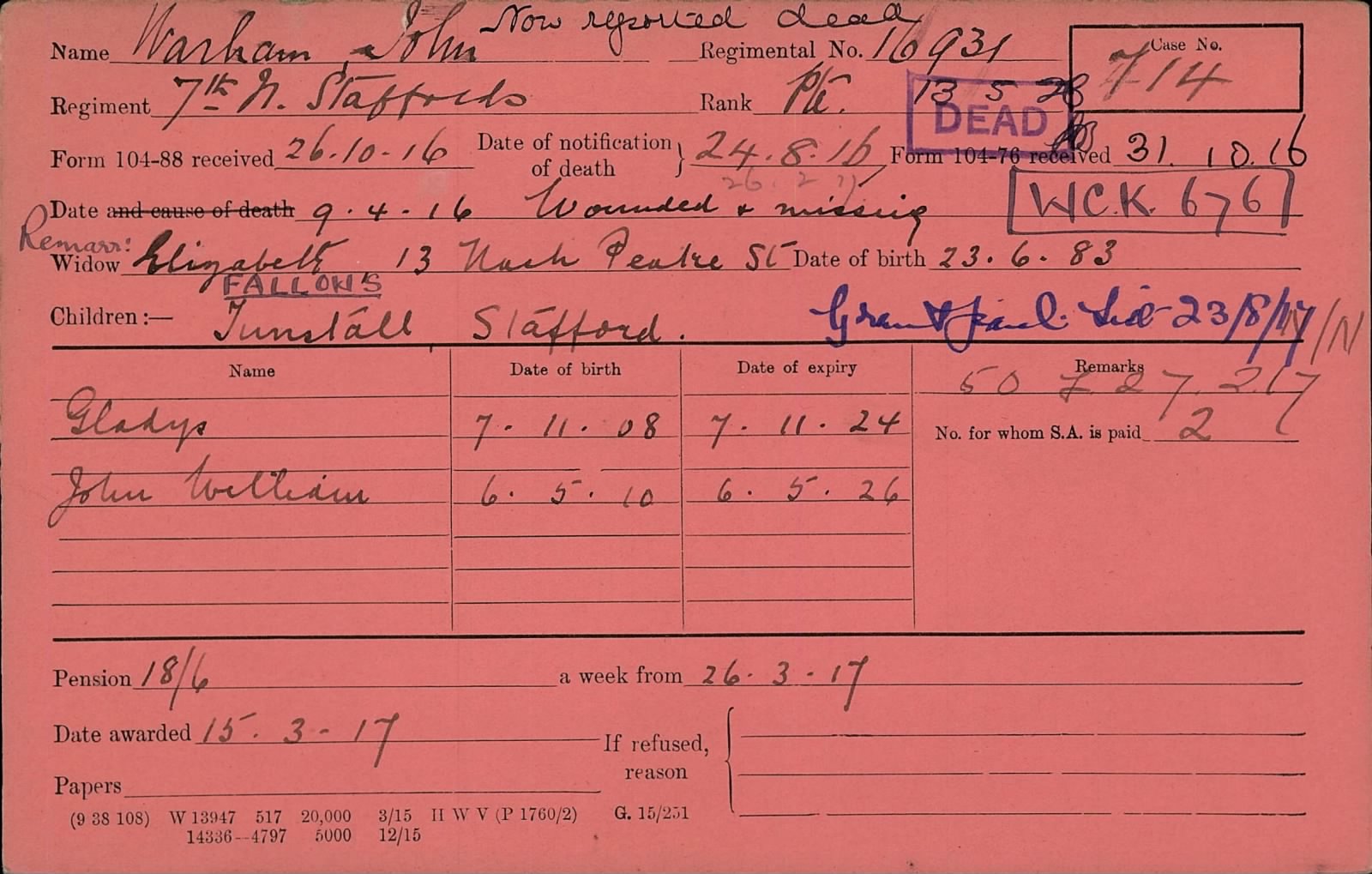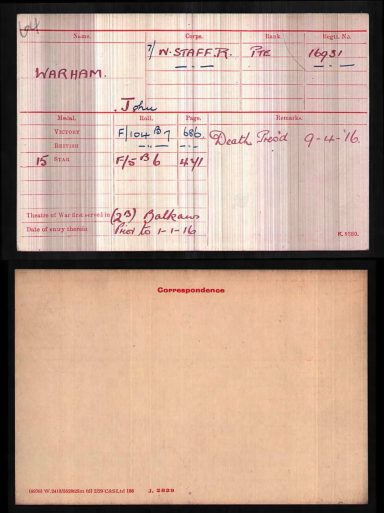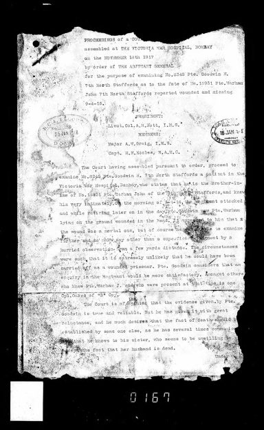 The court having assembled pursuant to order, proceed to examine No 8345 Pte. Goodwin H. 7th North Staffords, a patient in the Victoria war Hospital, Bombay, who states that he is the Brother in law of No.16931 Pte Warham John of the 7th North Staffords, and he knew him very intimately. On the morning of 9.4.16 the regiment attacked and while retiring later on the day, Pte Goodwin saw Pte. Warham lying on the ground wounded in the head. It appeared to him that the wound was a mortal one, but of course he was unable to examine further and so make any other than a superficial judgement by a hurried observation from a few yards distance. The circumstances were such that it is extremely unlikely that he could have been carried off as a wounded prisoner. Pte Goodwin considers that an enquiry in the Regiment would be more satisfactory. Amongst others who knew Pte Warham J. and who were present at that time is one Cpl Oakes of B Coy.