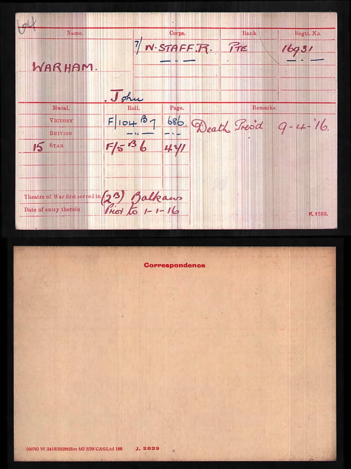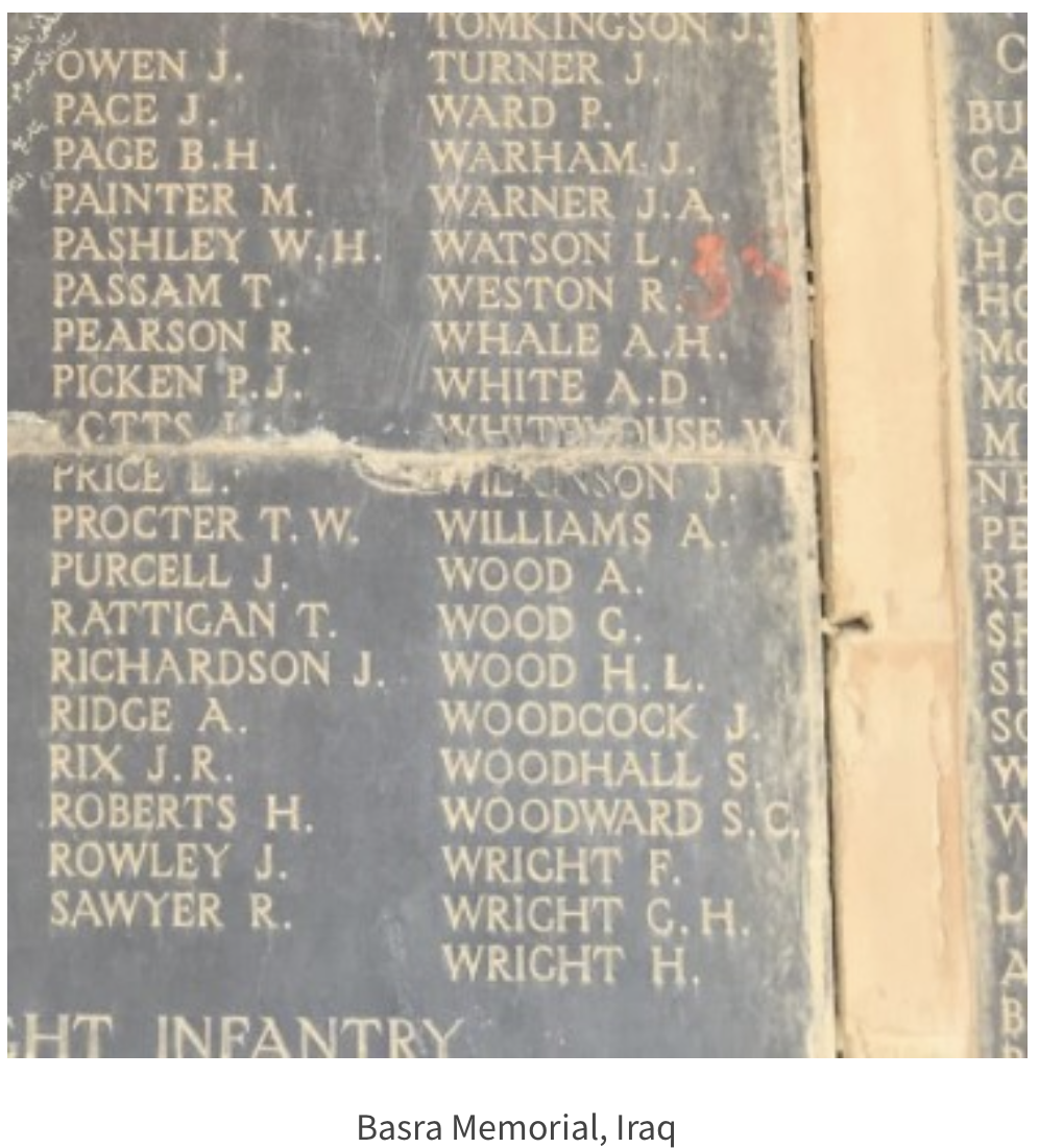 John Warham is remembered on the Basra Memorial Panel 34 as well as the Royal Doulton Memorial Burslem.