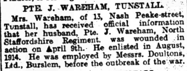 His attestation papers name his siblings as Tom Warham, Shrewsbury, Mrs Boulton of Woodland St, Tunstall, Mrs Barlow, Burslem, Amy Warham and Mary Ann Warham.