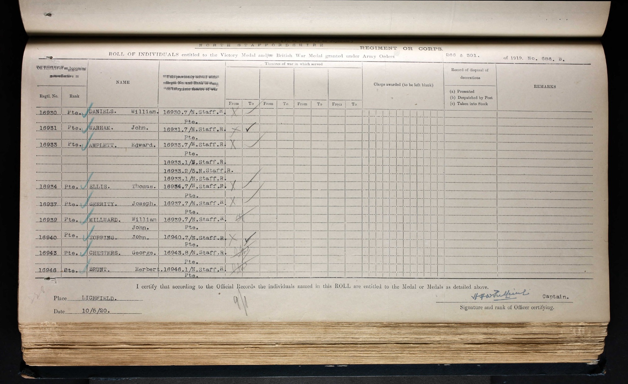 He was given the service number 16931 and rank of Private. Between September 1,1914 and September 20, 1915 he remained on “HOME” service. On September 21,1915 he was posted to the 7th Battalion North Staffordshire Regiment. There is little else in his records to say where exactly he was after this point but we can follow the diary of the 7th Battalion North Staffordshire Regiment that formed in 1914.