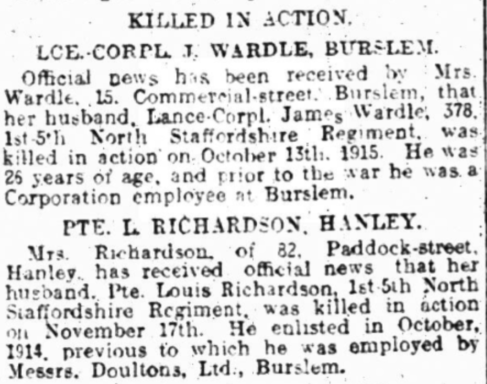 Contemporary newspapers articles of the Staffordshire Sentinel mention both Lewis (Louis) and John being reported Killed dated 03.01.1916 and 06.12.1917 and show that both had worked at Messrs Doulton Ltd prior to military enlistment.