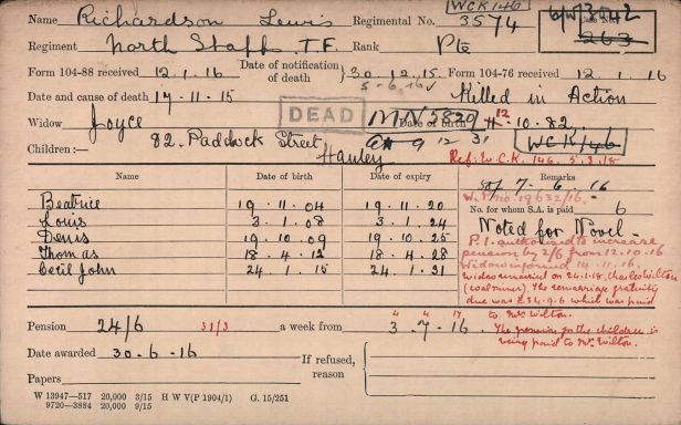 The census of 1911 shows Lewis living at 82 Paddock Street, Hanley having been married to Joyce for 11 years. The census shows that Joyce and Lewis had had five children by 1911 but only four had survived, James 11, Beatrice 6, Lewis 3 and Denis 1. Lewis is employed as an Earthenware Biscuit Placer. Boarding with them are his Brother James Richardson aged 40, an Earthenware Biscuit Placer and his children William Richardson aged 12 and Emily Richardson aged 8.