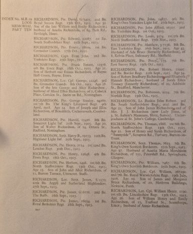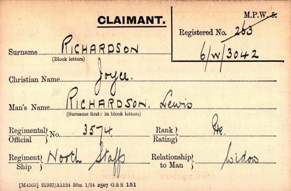 Pte 29215 James Richardson 3rd Battalion Notts and Derbyshire Regiment, of 26 Picton Street, Hanley, he survived the war being discharged due to sickness and awarded the Silver War Badge. He had served in the Balkans area and was awarded the 1914-15 Star, British War Medal and Victory Medal.