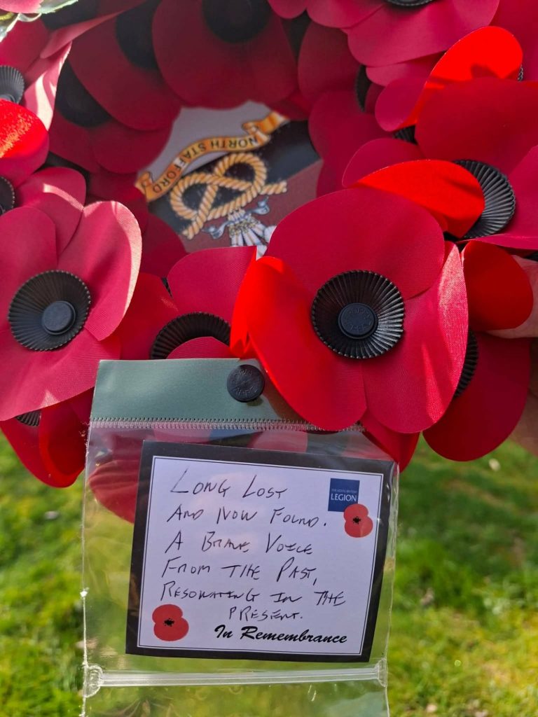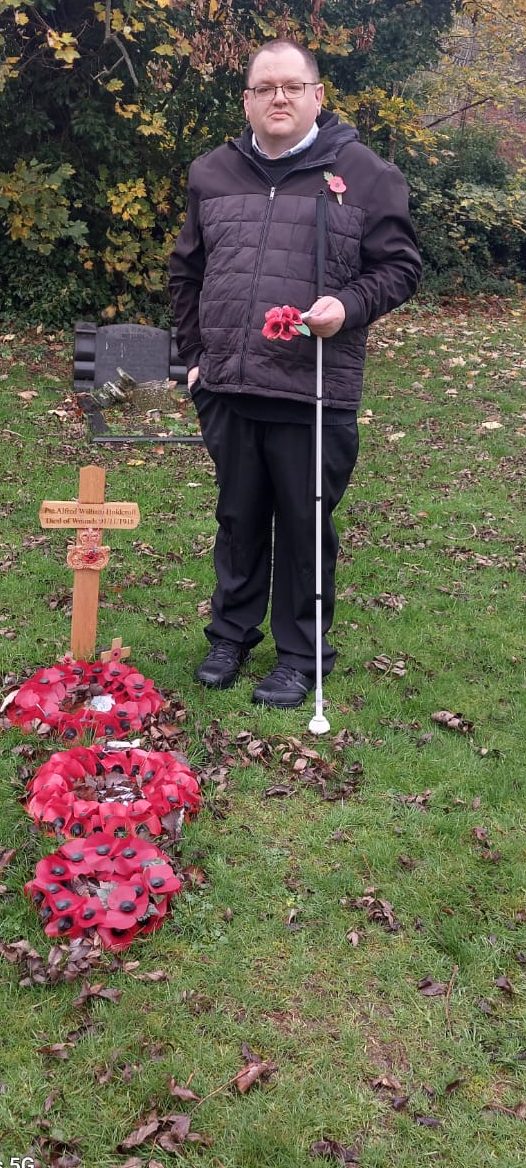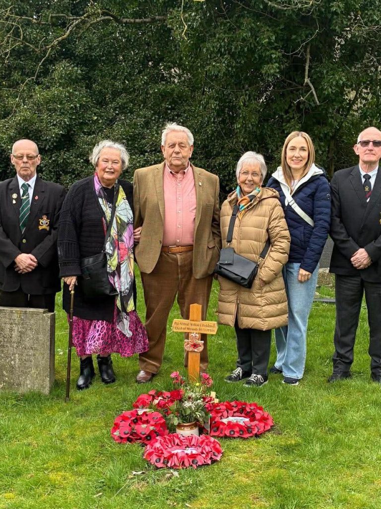Shortly after the rededication of Private Alfred William Holdcroft’s grave, we made contact with his great-great-nephew, Gareth Holdcroft, through our cold calling method and we were delighted when he replied. On Remembrance Sunday, Mike and I were kindly invited to meet Gareth and his mother, where we enjoyed several cups of tea while discussing the research and Alfred’s rededication service. On Remembrance Day, November 11, 2025, Gareth and Mike visited Alfred’s grave to lay a wreath. Gareth has fully supported our efforts to continue searching for other family members, and until recently, we had not managed to find any further relatives.